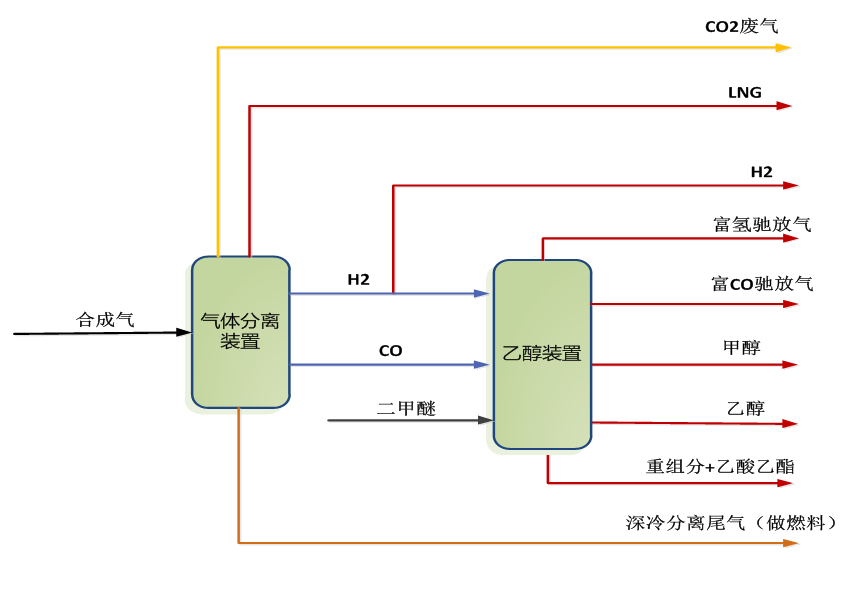 該項(xiàng)目主要產(chǎn)品乙�、甲�、氫�、LNG、重組分及乙酸乙酯。項(xiàng)目擬采用合成氣和二甲醚為原料:外來合成氣�(jīng)MDEA脫碳�,�(jìn)入氣體分離裝�,氣體分離裝置采用深冷分�+PSA工藝路線生產(chǎn)H2、CO,同�(shí)副產(chǎn)LNG及深冷分離尾氣(做燃料)。外來二甲醚與CO、H2�(jìn)乙醇裝置生產(chǎn)乙醇�(chǎn)�,同�(shí)副產(chǎn)甲醇、重組分及乙酸乙酯產(chǎn)��