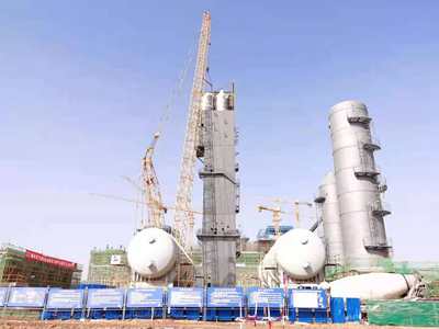 �(jù)�,該裝置主冷箱高�71�,總重約450噸,共六�。精餾塔總高�69米,總重�234�,直徑約4.8�。箱�(nèi)主設備分為四次吊裝完�,均采用450噸履帶吊為主吊,130噸汽車吊遛尾。安裝期間,參建各方嚴密配合、精心準�,安�、質(zhì)量嚴格把�,使得吊裝工作順利完��
