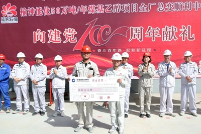 6�30�,由公司EPC總承包的榆神能化50萬噸/年煤基乙醇項目全廠總變中交暨向建�100周年�(xiàn)禮慶?;顒釉诳傋儸F(xiàn)場舉行�