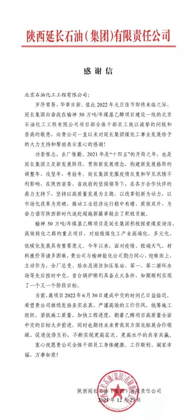 在北京石油化工工程有限公司總承包的延�(zhǎng)石油榆神能化50�(wàn)�/年煤基乙醇項(xiàng)目緊鑼密鼓、加快建�(shè)的關(guān)鍵時(shí)期,12�29�,陜西延�(zhǎng)石油(集�(tuán))有限責(zé)任公司向我公司發(fā)�(lái)感謝�,對(duì)我公�2021年乙醇項(xiàng)目建�(shè)工作給予了充分肯定和高度�(píng)�(jià)�
