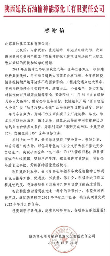 元旦前夕,北京石油化工工程有限公司先后收到延�(zhǎng)石油集團(tuán)和旗下的榆神能化公司�(fā)�(lái)的感謝信,信中對(duì)北油工程EPC總承包的50�(wàn)�/年煤基乙醇項(xiàng)目建�(shè)期間付出的辛勤勞�(dòng)表示感謝,并向項(xiàng)目現(xiàn)�(chǎng)廣大職工致以節(jié)日的�(wèn)��