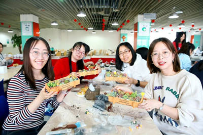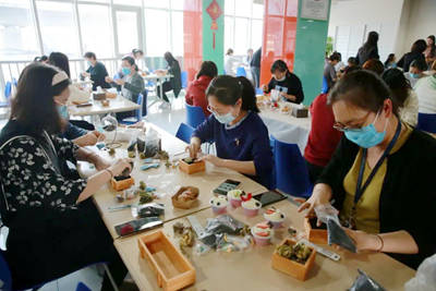 在下午開展的手工制作微景觀植物活動�,讓女職工顯露出動手的天�。工作人員事先準(zhǔn)備了制作微景觀多肉植物的相�(guān)材料,如玻璃瓶、木�、繁殖土、鋪面石、裝飾砂石、擺件等,大家將不同種類的多肉植物搭配在一起,填土、配�、種�、鋪�,不一會,一盆盆精美的盆栽爭奇斗�,大家分享經(jīng)驗,交流�(yǎng)�(hù)心得,釋放了壓力,舒緩了心情�