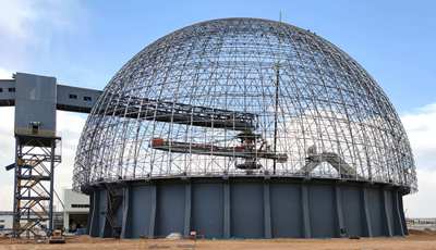 圓形煤場(chǎng)為全封閉半球形結(jié)�(gòu),建筑面積約5800平米,可堆放燃煤4萬噸燃煤,滿足全廠儲(chǔ)煤要求,是全廠最大的鋼網(wǎng)�(jié)�(gòu)建筑�