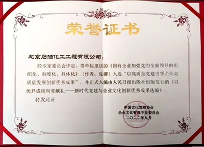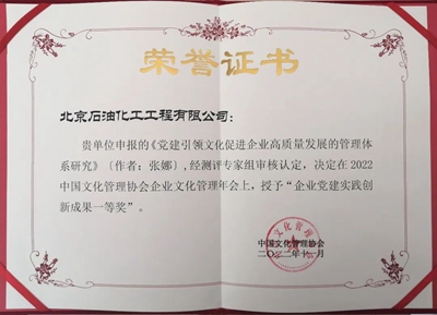 北京石油化工工程有限公司榮獲“黨建強企優(yōu)秀案例一等獎”。另�,公司黨委申報的2021年度�2022年度兩篇黨建和企�(yè)文化研究成果獲獎:《黨建引�(lǐng)文化促進企�(yè)高質(zhì)量發(fā)展的管理體系研究》榮獲“企�(yè)黨建實踐�(chuàng)新成果一等獎�;《國有企�(yè)加強黨的全面�(lǐng)�(dǎo)的組織化、制度化、具體化》入選“以高質(zhì)量黨建引�(lǐng)企業(yè)高質(zhì)量發(fā)展創(chuàng)新優(yōu)秀成果�,并正式入編由人民日報出版社出版�(fā)行的《以�(yōu)異成績向黨獻禮——新時代黨建與企�(yè)文化�(chuàng)新優(yōu)秀成果選編��