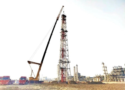 �(jù)悉,該火炬高80�,總�100噸,分三段在地面組裝后依次進行吊裝。為確保吊裝工作的順利進行,項目部組織�(yè)主、監(jiān)理、承包商對火炬組裝的�(zhì)量及組裝臨時平臺的搭設情況進行全方位檢�,吊裝過程中,項目人員嚴格按照操作規(guī)程執(zhí)�,確保吊裝作�(yè)的安�、平�(wěn)。目�,施工人員正加緊配套地面火炬管廊、附屬設備等相關工作,加班加點確保火炬按期投��